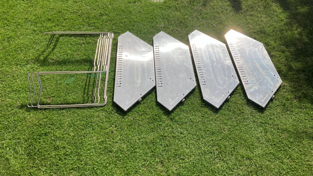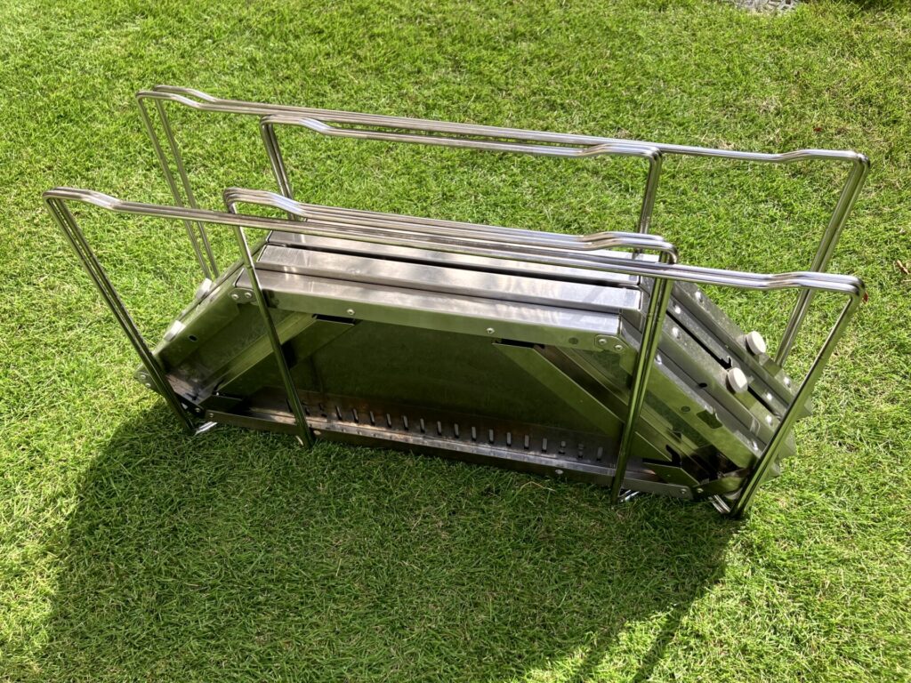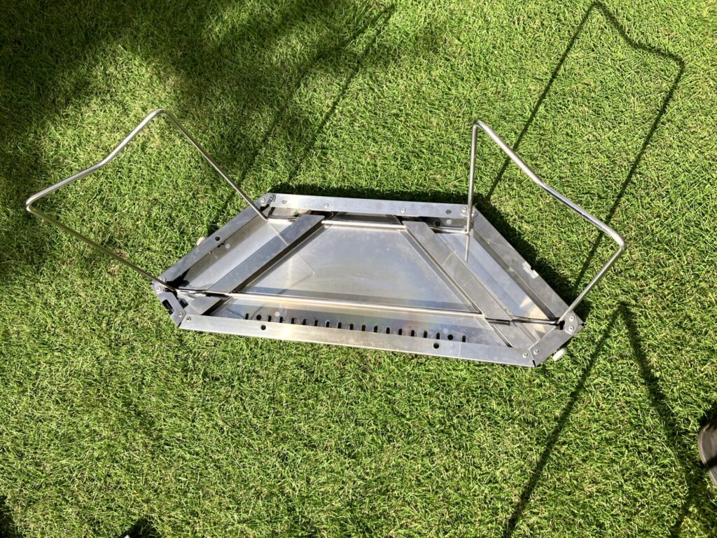 また、道具の性質上、安定して欲しいものなので、重量のあるステンレス製にしたんでしょうね。仮に軽量のアルミだったら安定性が無くてちょっと使いにくいし、子どもを焚火から遠ざける防御壁としてもドッシリ感は欲しいですしね。