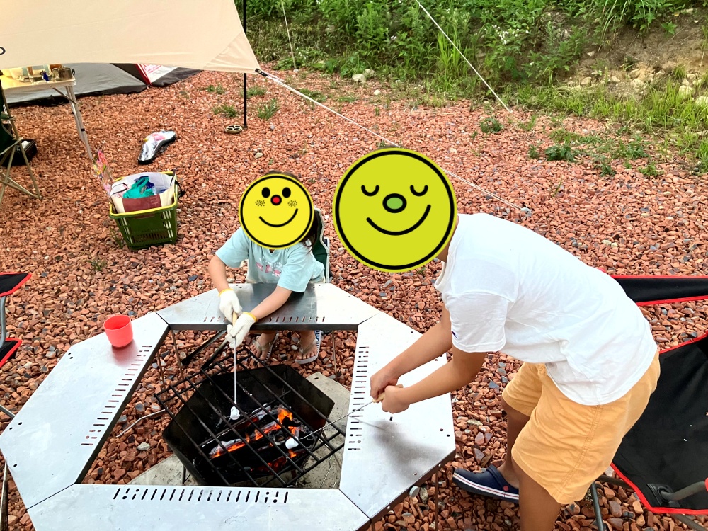 写真を見返していたら、子どもは一生懸命マシュマロを焼いていました(笑)。ジカロテーブルがあると焚火台からの距離が確保できて安心です。
