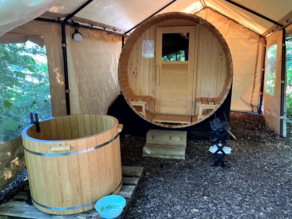 私は利用する余裕がなく、キャンプ場散策で見ただけなのですが、バレルサウナ(樽状のサウナ)が森の中にあります。